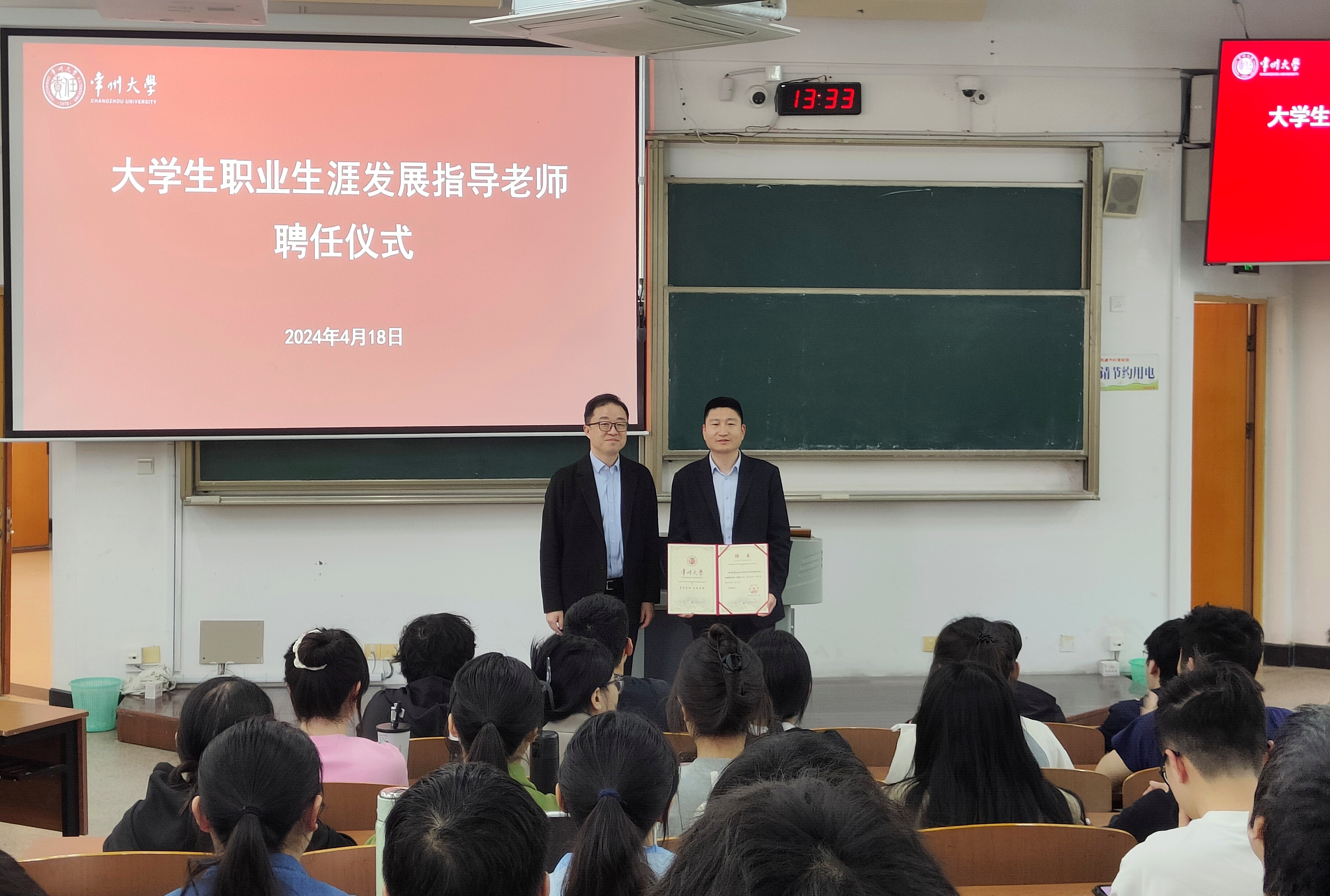 交流會后,周剛為曹其林頒發“大學生職業生涯發展指導老師”聘書,曹其林為機械學院學生開展“求職準備及擇業定位”生涯指導講座。(通訊員/陰祥 審核/蔣琳 編輯/莊媛)