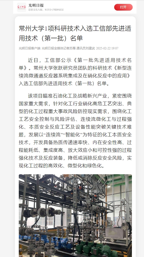 近日,工信部公示《第一批先進適用技術名單》。常州大學張躍研究員團隊的科研技術《新型連續流微通道反應器系統集成及在硝化反應中的應用》入選工信部先進適用技術(第一批)名單。