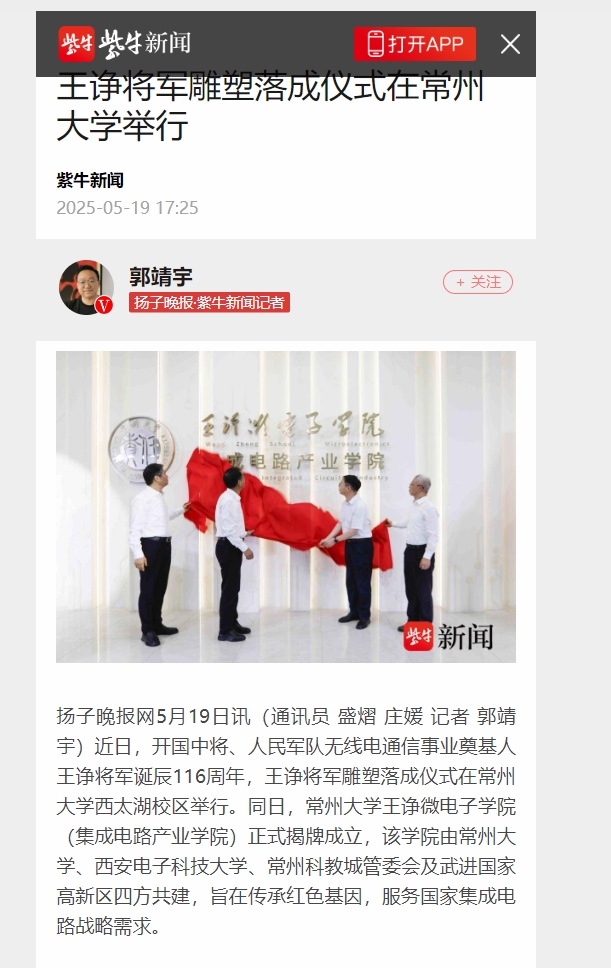 近日,開國中將、人民軍隊無線電通信事業奠基人王諍將軍誕辰116周年,王諍將軍雕塑落成儀式在常州大學西太湖校區舉行。同日,常州大學王諍微電子學院(集成電路產業學院)正式揭牌成立,該學院由常州大學、西安電子科技大學、常州科教城管委會及武進國家高新區四方共建,旨在傳承紅色基因,服務國家集成電路戰略需求。