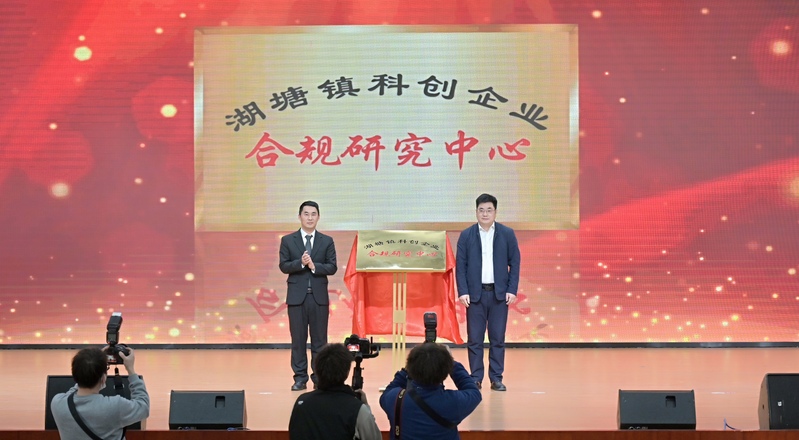 張建在“企業合規研究中心”揭牌儀式環節上臺揭牌,趙赤應聘擔任湖塘鎮科創企業合規研究中心副主任。